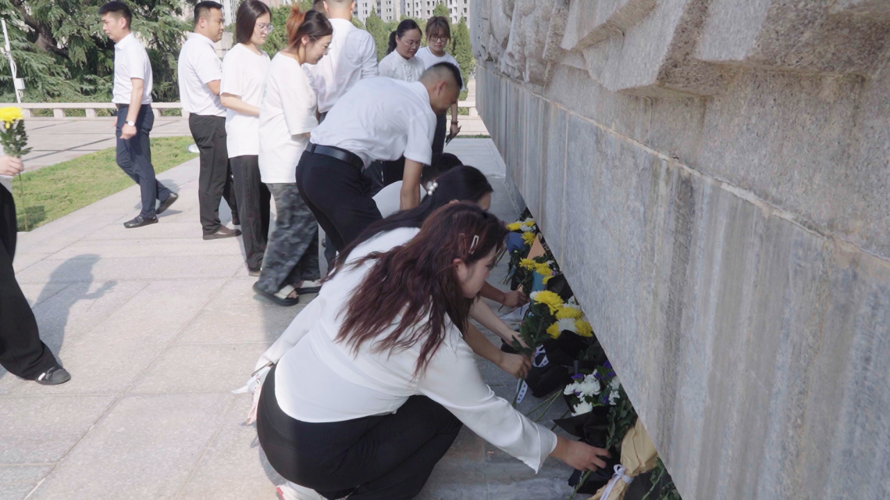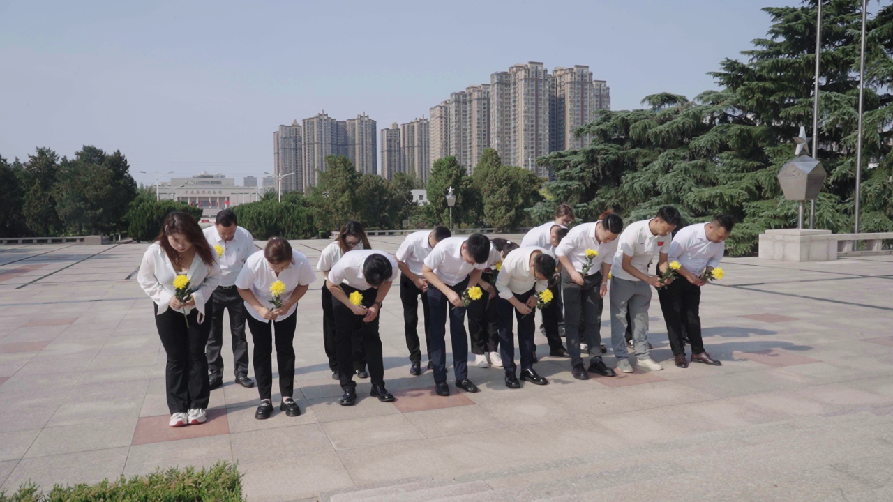 在革命烈士纪念碑前,高管们手持黄色菊花,神情肃穆,缓步走向纪念碑。